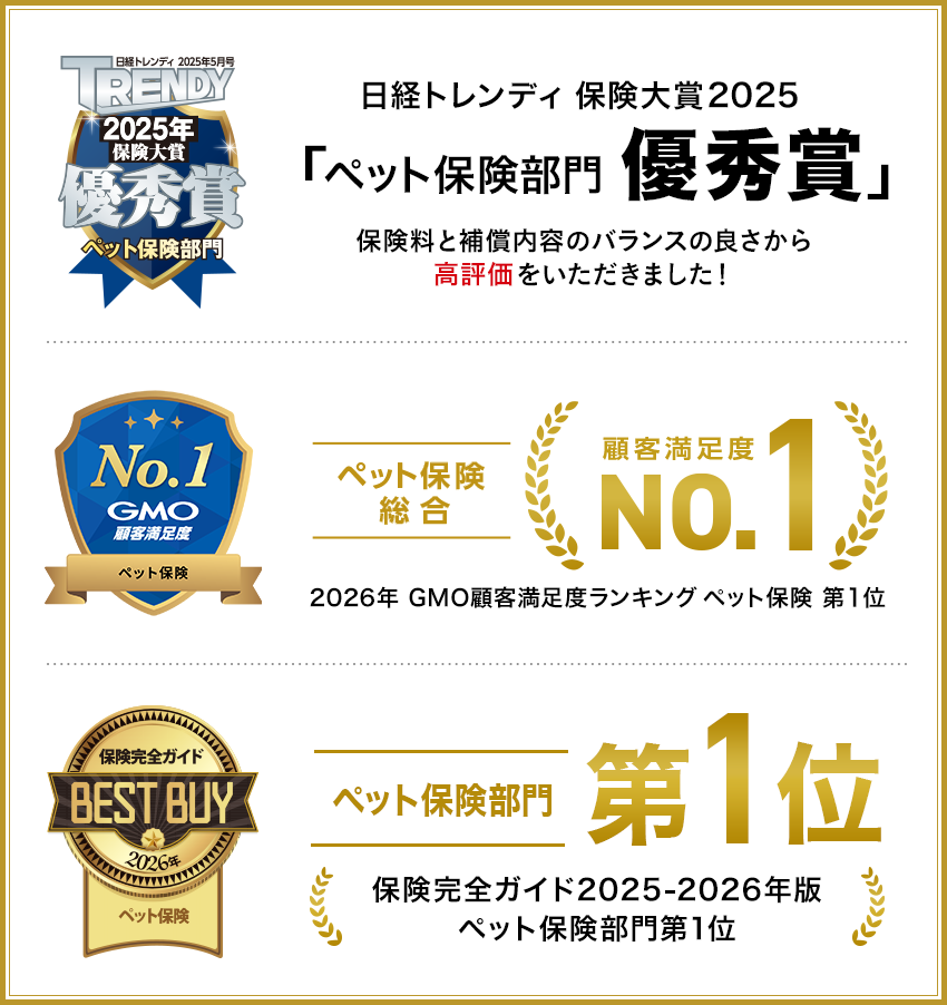 実際にペット保険を利用した方を対象に実施された「GMO顧客満足度ランキング」(2025年11月21日~12月22日)において、ペット保険第1位を受賞いたしました。